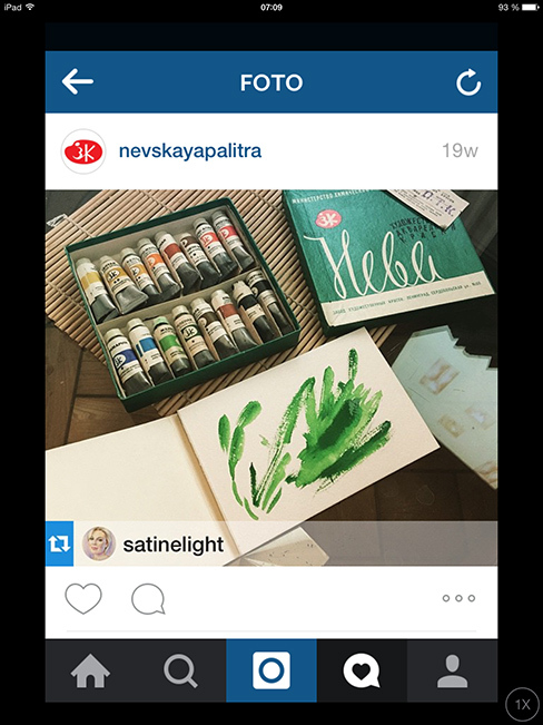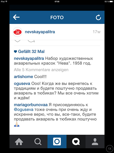 Неожиданно для себя обнаружила инстаграм Невской палитры — @nevskayapalitra. Не самый разговорчивый, но уже что-то! Так что если вам давно хотелось спросить: «где акварель поштучно в тюбиках, Карл?» Или «почему кюветки с одинаковой краской различаются так, словно они даже не родственники» — вам сюда. Хотите пишите в комментариях, хотите призывайте в комментарии к себе в блог. Даже если в ответ промолчат, есть надежда, что на создании инстаграма Невская палитра не остановится и найдет своему представительству в инсте кого-нибудь более разговорчивого. А там может быть и мнения покупателей начнет учитывать, как знать?