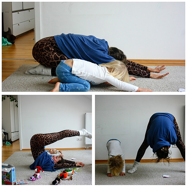 Йога! Потихоньку учусь разным комплексам, нравится она мне черезвычайно, со всех сторон. Разминает, потягивает, успокаивает и расслабляет одновременно. А теперь, спасибо Эндрю, у меня есть мягчайший коврик и пара отличных комбезов. Диана не отстает :)